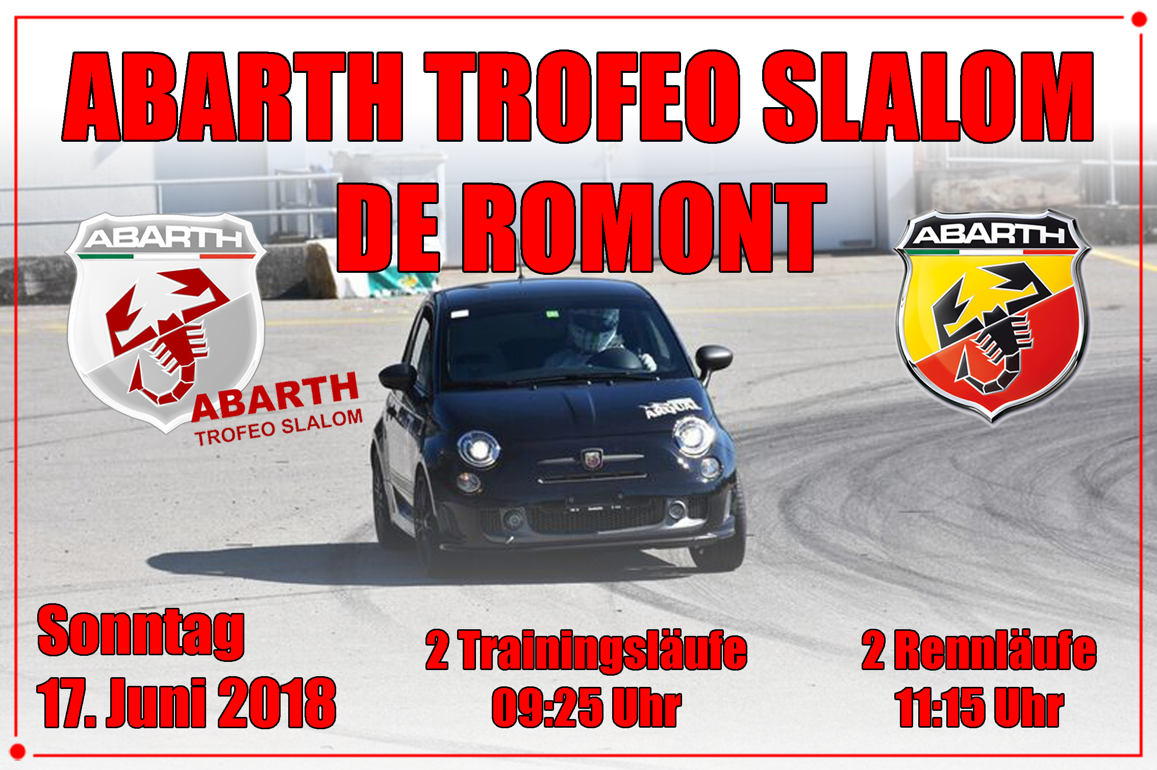 Am Sonntag 17. Juni 2018 findet der vierte Slalom der diesjährigen Meisterschaft in Romont statt. Komm doch am Sonntag vorbei und besuche das Abarth-Team. Neben dem Austausch mit anderen Abarthfanatikern, kannst Du dich von unserem Catering im Abarth-Zelt verwöhnen lassen.